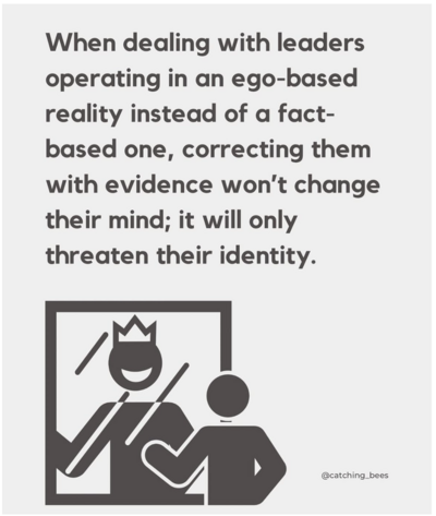 "When dealing with leaders operating in an ego-based reality instead of a fact based one, correcting them with evidence won't change their mind; it will only threaten their identity."