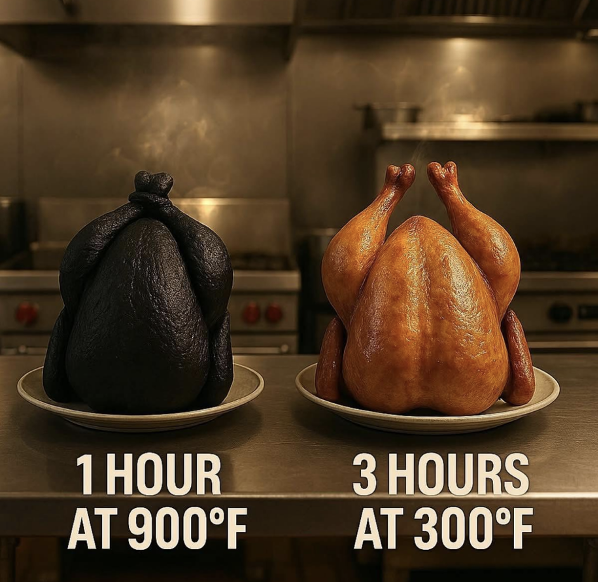 Have ever been at a holiday meal where time got away from you and the turkey was put in the oven at a high setting, so it was “done” with the rest of the meal? Yeah. Me too. We’ve all seen it, right? Compare the two turkeys. The crispy, blackened turkey on the left and the golden, juicy masterpiece on the right. Same bird, different approach. The lesson? It’s not just what you cook, it’s how you cook it.