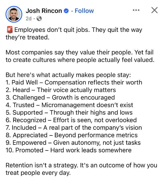 I cringe every time I hear, “do well and you will earn a pizza party” . Are we not adults? Josh Rincon nailed it with his list. People want to be paid well, heard, trusted, supported, recognized, included, appreciated, empowered, and promoted. That’s not “fluff”: that’s culture! But here’s the kicker: all that rests on psychological safety. Without it, recognition feels fake, support feels conditional, and “empowerment” is just code for “do more with less.” If your team doesn’t feel safe enough to raise their hand and say, “Hey, I need help,” or “This process is a dumpster fire,” then all the HR initiatives in the world won’t keep us around. We will quietly polish up our LinkedIn profiles and bounce the second another company offers us an ounce of respect.